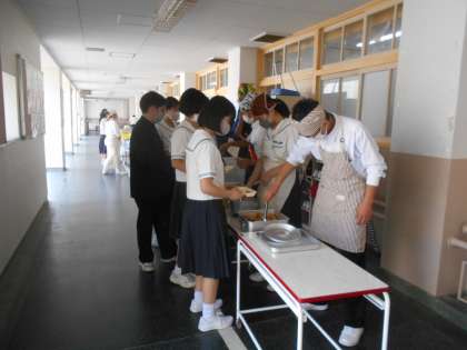 (写真は、2年生廊下での2年生の給食準備の様子です。)