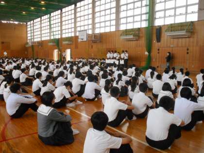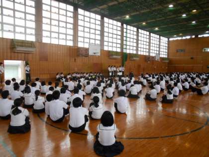 本日、体育館で生徒会集会を行いました。各生徒専門員会の代表から報告がされて、生徒会役員からは挨拶がありました。