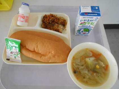 本日の献立は、コッペパン、ソフトマーガリン、ジャガイモのミートグラタン、スープ、発酵乳、牛乳です。