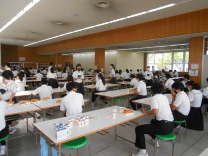 (写真は、昼食ホールでの3年生の給食準備の様子です。)