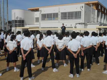 2年生の学年集会を下グランドで行いました。田中先生から、天文学に関わる天体望遠鏡の技術革新をもとに「興味・関心をもって調べること」についてのお話がありました。
