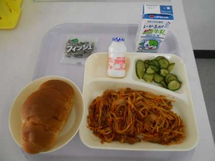本日の献立は、黒糖パン、スパゲッティミートソース、キュウリのピクルス、ミニフィッシュ、発酵乳、牛乳です。
