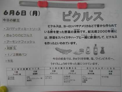 本日の献立に登場した「キュウリのピクルス」の「ピクルス」は、ヨーロッパやアメリカなどで昔からつくられている酢を使った野菜の漬け物のことです。