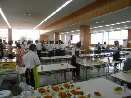 (写真は、昼食ホールでの1年生の給食準備の様子です。)
