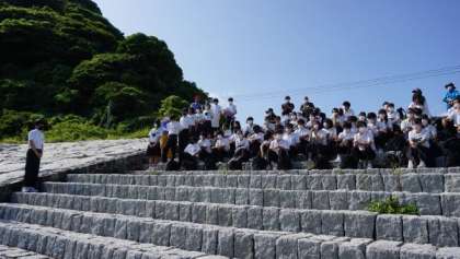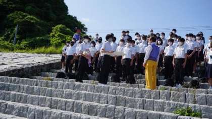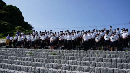 佐々木くんの司会でセレモニーが始まり、全員で黙祷を捧げました。黙祷が終わり、生徒代表者が平和宣言が読みあげ、京村くんからは記念品の贈呈、長町くんからは花束の贈呈を行われました。