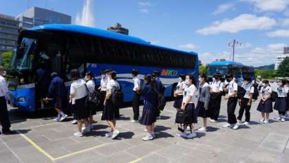 広島平和記念公園周辺での平和学習を終えて、午後からの体験活動のために安芸太田町へと向かいます。