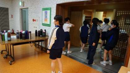 子どもたちが、入浴を終えて、夕食会場に集まって来ました。