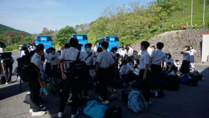 荷物を持って、退所式に向かいます。