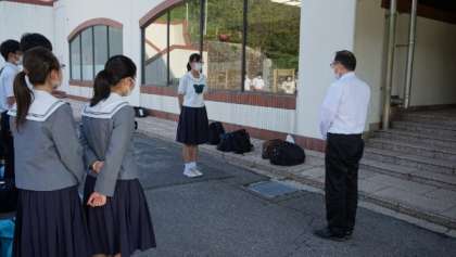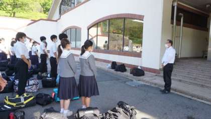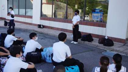 退所式の後は、バスに乗車して、宮島へと向かいます。