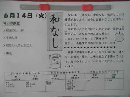 本日の献立に登場した「和なし」などの「なし」は、日本なし、中国なし、西洋なしの3種類があります。給食では、日本なしと西洋なしが登場します。本日の「和なし」は、幸水、豊水、二十世紀などが使われたものです。