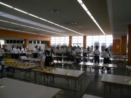 (写真は、昼食ホールでの1年生の給食準備の様子です。)