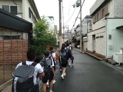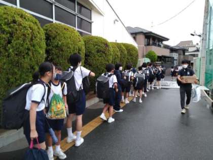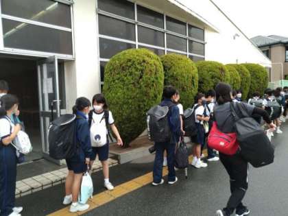 1組から順に1列で、バスの乗車に向かいます。2組、3組と順番に出発となりまし