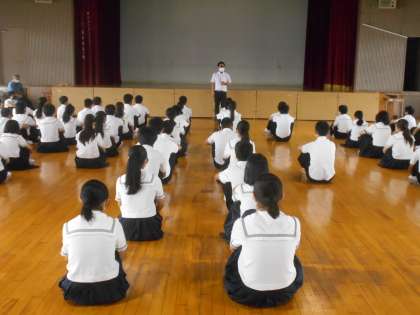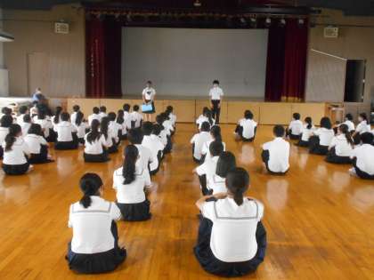 3年生の学年集会を講堂で行いました。進路指導主事の池永先生からは、高校のパンフレットの展示についての説明があり、各生徒専門委員会の代表者からは活動の目標や活動の報告などがありました。