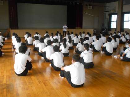 3年生の学年集会を講堂で行いました。東野先生から、修学旅行での平和学習の学びから考えてほしいことについてのお話がありました。