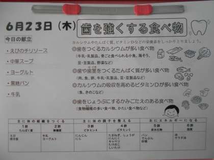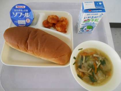 本日の献立は、黒糖パン、エビのチリソース、中華スープ、ヨーグルト、牛乳です。