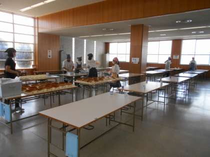 (写真は、昼食ホールでの1年生の給食準備の様子です。)