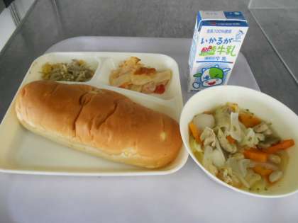 本日の献立は、おさつパン、ジャガイモとトマトのチーズ焼き、モヤシとコーンのソテー、鶏肉とてぼ豆のスープ煮、牛乳です。