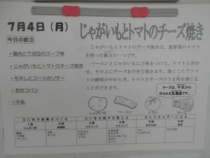 本日の献立「ジャガイモとトマトのチーズ焼き」には、食材としてジャガイモと夏野菜であるトマトが使われます。トマトにチーズをのせて焼くことでトマトの酸味がやわらぎ旨味を感じることができる献立となっています。