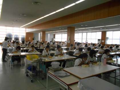 (写真は、昼食ホールでの1年生の給食の様子です。)