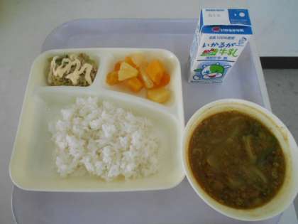 本日の献立は、夏野菜のキーマカレーライスゴーヤとツナのマヨネーズ風味、ミックスフルーツ、牛乳です。