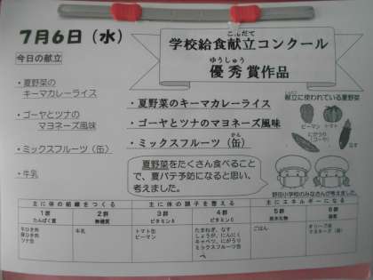 本日の献立は、学校給食献立コンクールで優秀賞作品に選ばれたメニューとなっています。夏野菜をたくさん食べることで、夏バテを防ごうといった思いで、考えられたメニューとなっています。