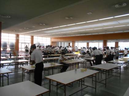 (写真は、昼食ホールでの3年生の給食準備の様子です。)