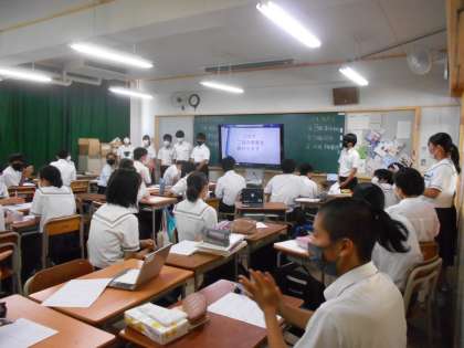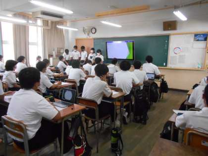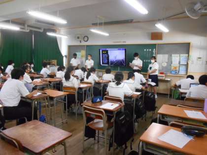 3年生では、「戦争のない世界をめざして」をテーマとして、修学旅行のフィールドワークのまとめを中心とした平和学習のまとめとなる発表会が行われました。