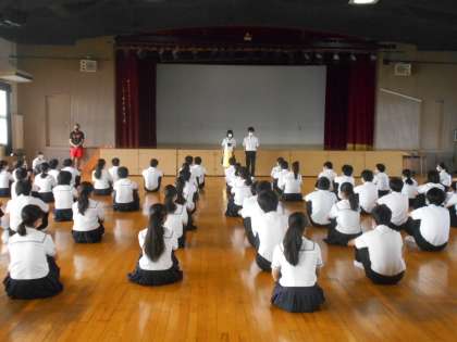 3年生の学年集会を講堂で行いました。学年主任の木村先生から、3年生として部活動での最後の大会に向けて、これまで以上に新型コロナウイルス感染症の拡大防止のための意識した行動が何よりも大切であるというお話がありました。また、各生徒専門委員会からの報告がありました。