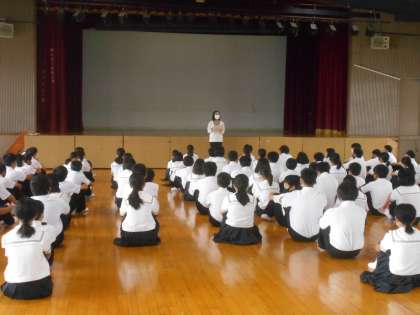 1年生の学年集会を講堂で行いました。姜先生からは、日ごろの友だち同士の「言葉づかい」について今一度考えるべきことについてのお話がありました。また、大倉先生からは、英語の授業でのパワーポイント発表会の優秀賞に選ばれた生徒の表彰が行われました。