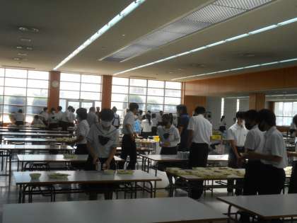 (写真は、昼食ホールでの3年生の給食準備の様子です。)
