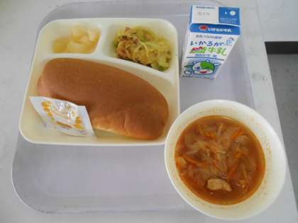 本日の献立は、コッペパン、マーマレード、豆乳マカロニグラタン、トマトスープ、洋ナシ、牛乳です。