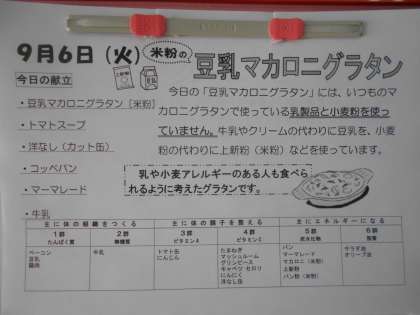 本日の献立「豆乳マカロニグラタン」は、日頃使われている乳製品や小麦粉を使わないで、牛乳やクリームの代わりに豆乳を、小麦粉の代わりに上新粉(米粉)などを使ってつくられています。