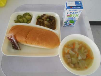 本日の献立は、コッペパン、イチゴジャム、牛肉のデミグラスソース煮、キュウリのピクルス、スープ、牛乳です。