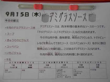 本日の献立「牛肉のデミグラスソース煮」で使われた「デミグラスソース」は、西洋料理で使われる基本的なソースの一つで、牛のすね肉や骨、香味野菜、褐色のブラウンルウ、トマトピューレなどを煮込んでつくられます。