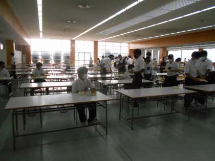 (写真は、昼食ホールでの3年生の給食準備の様子です。)