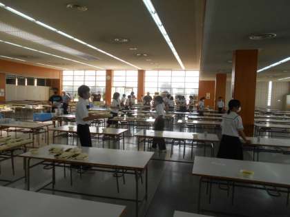 (写真は、昼食ホールでの1年生の給食準備の様子です。)