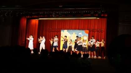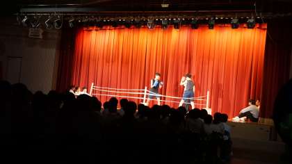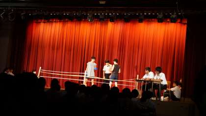3年2組による劇「永遠(とわ)のライバル」の舞台発表の様子です。