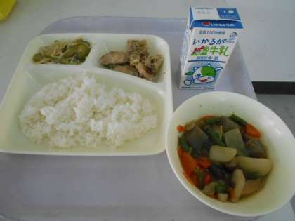 本日の献立は、ごはん、豚肉のネギ醤油焼き、キュウリとモヤシの甘酢和え、吹き寄せ煮、牛乳です。