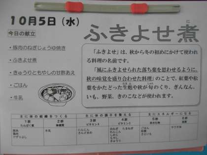 本日の献立「吹き寄せ煮」の「吹き寄せ」は、秋から冬の初めにかけてつくられる料理で、生麩や栗、銀杏、芋、野菜、キノコなどがよく使われます。