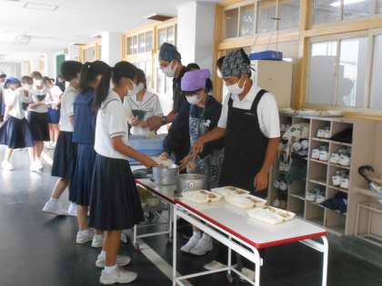 (写真は、2年生廊下での2年生の給食準備の様子です。)