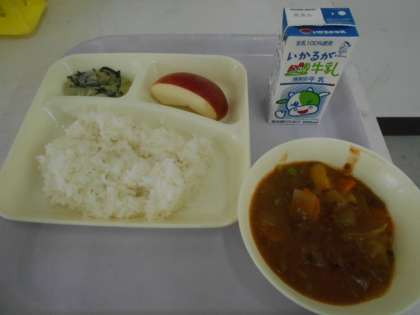 本日の献立は、ハヤシライス、キャベツのひじきドレッシング、リンゴ、、牛乳です。