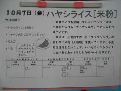 本日の献立に登場した「ハヤシライス」は、ルウには米粉が使われており、日ごろ私たちが食べるハヤシライスに比べると、あっさりとした味わいとなっています。