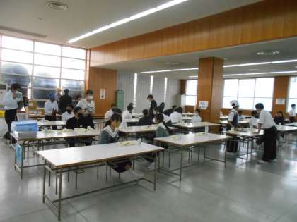 (写真は、昼食ホールでの1年生の給食準備の様子です。)