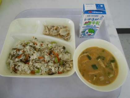 本日の献立は、モズクと豚ひき肉のジューシー、焼きレンコン、サツマイモの味噌汁、牛乳です。
