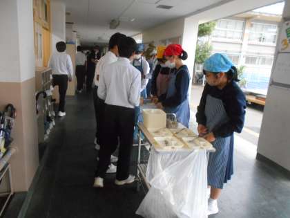 (写真は、2年生廊下での2年生の給食準備の様子です。)
