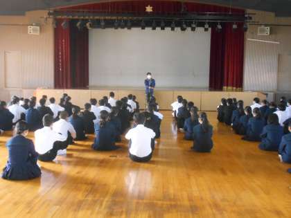 2年生の学年集会を講堂で行いました。上床先生から、陰で支えてくれている人たちの存在と気づき、そして、感謝の気持ちをもつことの大切さについてのお話がありました。