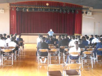 3年生の学年集会を講堂で行いました。学年主任の木村先生から、本日の6限に行われる進路学習の一環となる「面接についての講話」についての説明がありました。