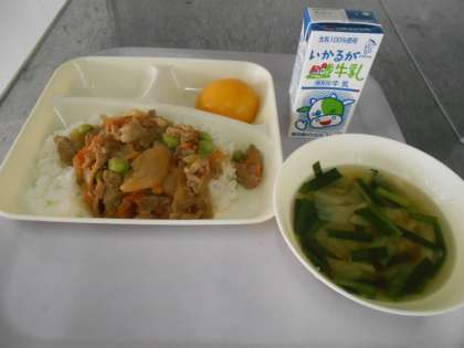 本日の献立は、ピリ辛丼、中華スープ、黄桃、牛乳です。
