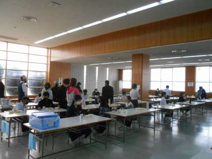 (写真は、昼食ホールでの1年生の給食準備の様子です。)
