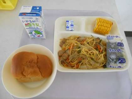 本日の献立は、黒糖パン、固形チーズ、ウインナーときのこの和風スパゲッティ、牛乳です。